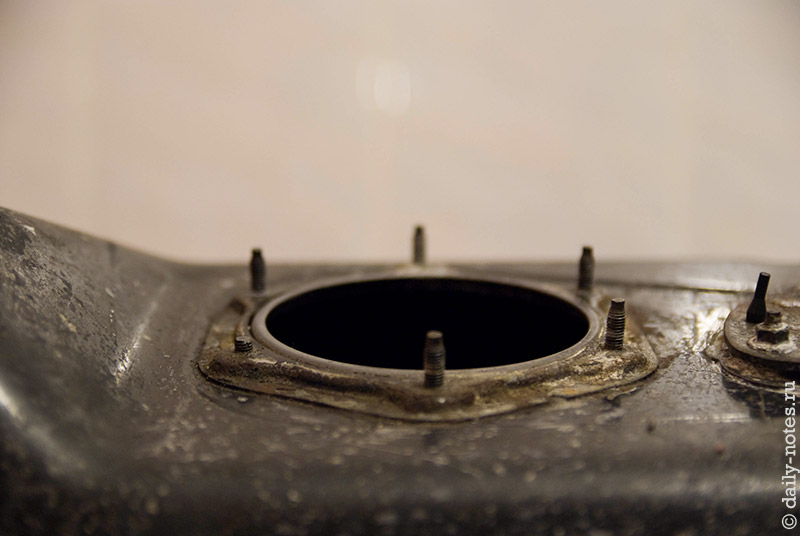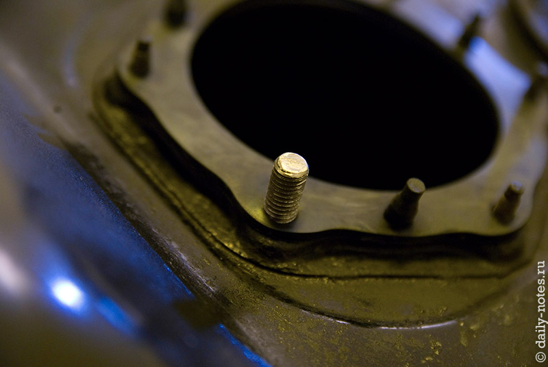 Как видно — от шпильки остался пенек. Кольцо, держащее шпильки приварено к баку и не съемное, т.е. заменить быстро шпильку возможности нет. Но не все потеряно, будем колхозить новую.