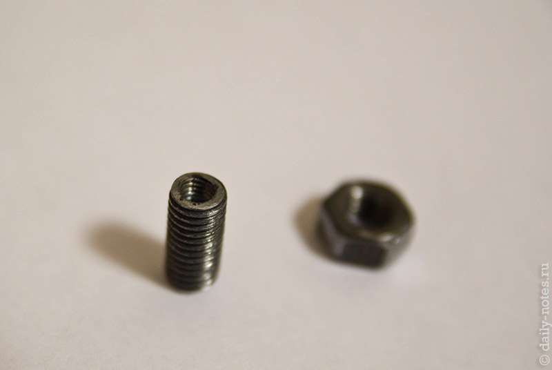 Потом я изготовил новую шпильку из болта большего диаметра чем бывшая шпилька. Просверлил в болте отверстие, нарезал резьбу и получилось что-то подобное:
