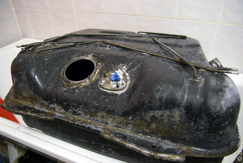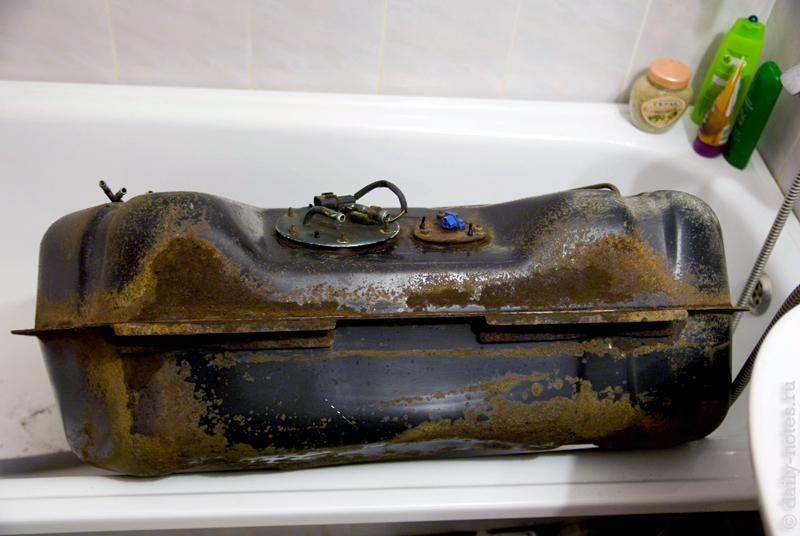 Поскольку гаража у меня нет — принес это чудо домой. В баке были остатки бензина, которые не удавалось слить через сливную пробку, зато они отлично испарялись через остальные отверстия. Решено было открыть бак, помыть его внутри, заменить бензонасос, заменить сетку бензонасоса, все это ободрать шкуркой, обработать преобразователем ржавчины и покрасить.