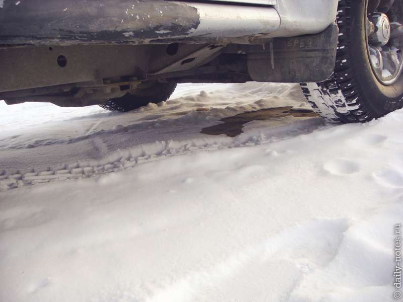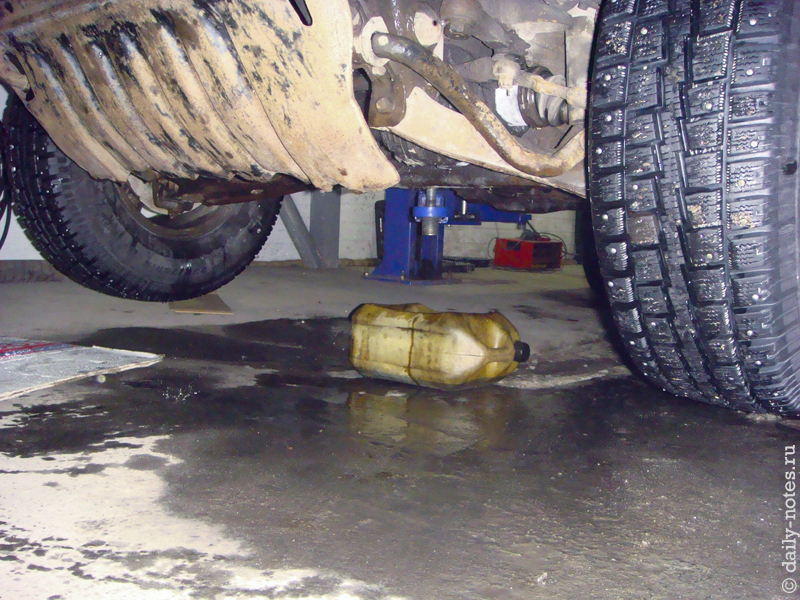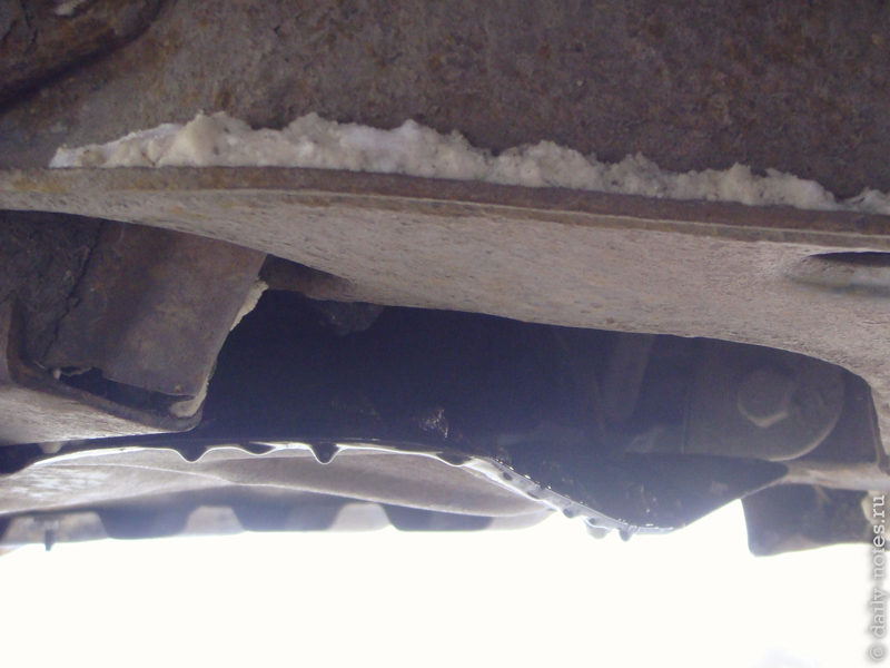 Через некоторое время стали появляться чавкоющие звуки, которые, как мне показалось, доносились где-то в районе коробки. В это время я начал помаленьку отпускать сцепление. Подумалось — вот из коробки видимо замерзшее масло выдавливать стало :(. Подождал еще маленько, отпустил сцепление и вылез оглядывать коробку. Смотрю — коробка сухая, обрадывался было, затем смотрю под двигатель — …!