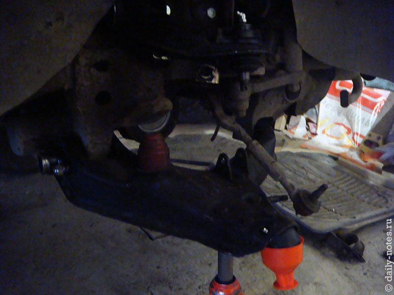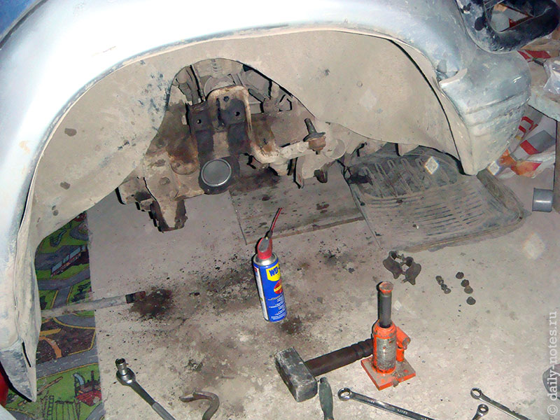 Снимаю нижний рычаг. Для снятия потребовалось снять передний стабилизатор. «Яйца» стабилизатора так прикисли к рычагам, что пришлось их с ними и оставить — открутил крепления от стабилизатора. Далее открутил передний болт рычага — гайка откручивалась исключительно кувалдой и со скрипом даже под WD-40, однако болт свободно вращался во втулке сайлентблока. Затем открутил задний болт, тоже не без помощи кувалды.