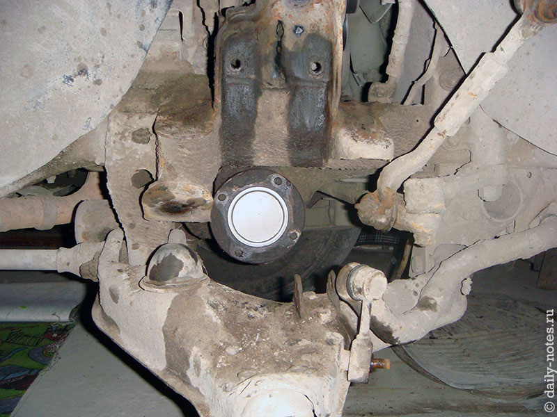 Привод установил на положенное место и начал заниматься ступицей. Было дело — купил ступицы в прошлом году контрактные, состояние «в идеале». Очень не хотелось с ними заморачиваться, поэтому решил смыть с них пыль и поставить за место своих. Мыл керосином в отверстии для вала, после чего решил, что достаточно — подсушил и понес одевать на машину. Была найдена медная шайба-прокладка со старой ступицы, но по мануалу я ее не разглядел (в мануале она позже нашлась в разделе про поворотный кулак), но нашел в другом месте — в мосту. Решил что это какой-то колхоз, т.к. с ней ступица не одевалась на вал и одел ступицу без нее (не стоит так делать). Далее все собрал, затянул шаровые и присоединил тормозные шланги. Осталось поставить торсион, однако его крепление закисло и никакие кувалды и замачивания не помогали.