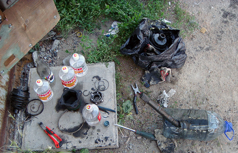 День четвертый. Перебираю привод. Для мытья привода использовал керосин — хорошо отмывает смазку. Разборка привода тривиальна — снимаем внешнее стопорное кольцо внутренней гранаты, далее снимаем внутреннюю обойму с сепаратором и шарами (не стоит их терять и путать местами). Затем внутреннее стопорное кольцо внутренней гранаты. Далее снимаем пыльник внутренней гранаты, за ним пыльник внешней гранаты. Затем внутреннее стопорное кольцо внешней гранаты. Вроде все, внешняя граната не разборная.