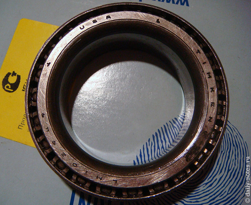 День шестой. Решил отрегулировать подшипники ступицы. Открыл крышку ступицы, подлез к 2м винтам стопорного кольца ступичной гайки и сорвал им шлицы. Далее много мата, снимаю ступицу и откручиваю эти винты газовым ключом (без снятия мешает вал привода). Далее откручиваю ступичную гайку импровизированным инструментом (из 3х болтов и стальной пластины) и вынимаю подшипник. Тут увидел, что в ступице много старой смазки — решил ее тоже всю извлечь и забить новой. Подшипник промыл в керосине, все смазал ступичной смазкой, после чего закрутил и поставил обратно на рычаги. Вот так выглядит внешний подшипник: