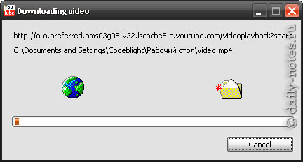 Далее пойдет прогресс сохранения видео. При необходимости его можно отменить кнопкой «Cancel». После сохранения видео с youtube вы увидите следующий диалог.