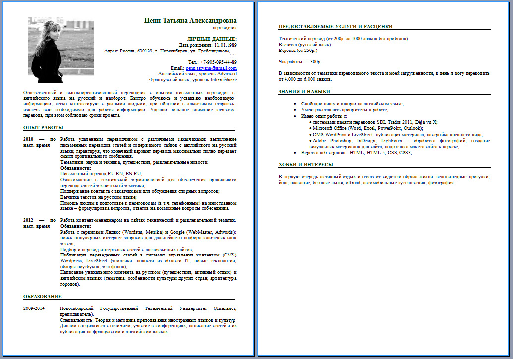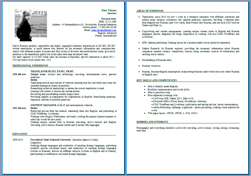 Образец резюме переводчика (в качестве примера оформления мои черновые варианты, просьба не копировать):