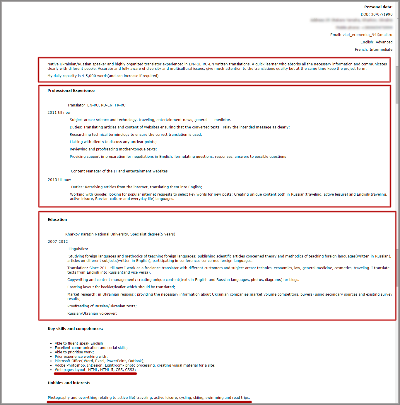 UPD. Спустя 4 года (ого!) я решила написать к статье небольшой апдейт, в котором хочу подчеркнуть, как НЕ нужно составлять резюме переводчика после прочтения данной статьи.
