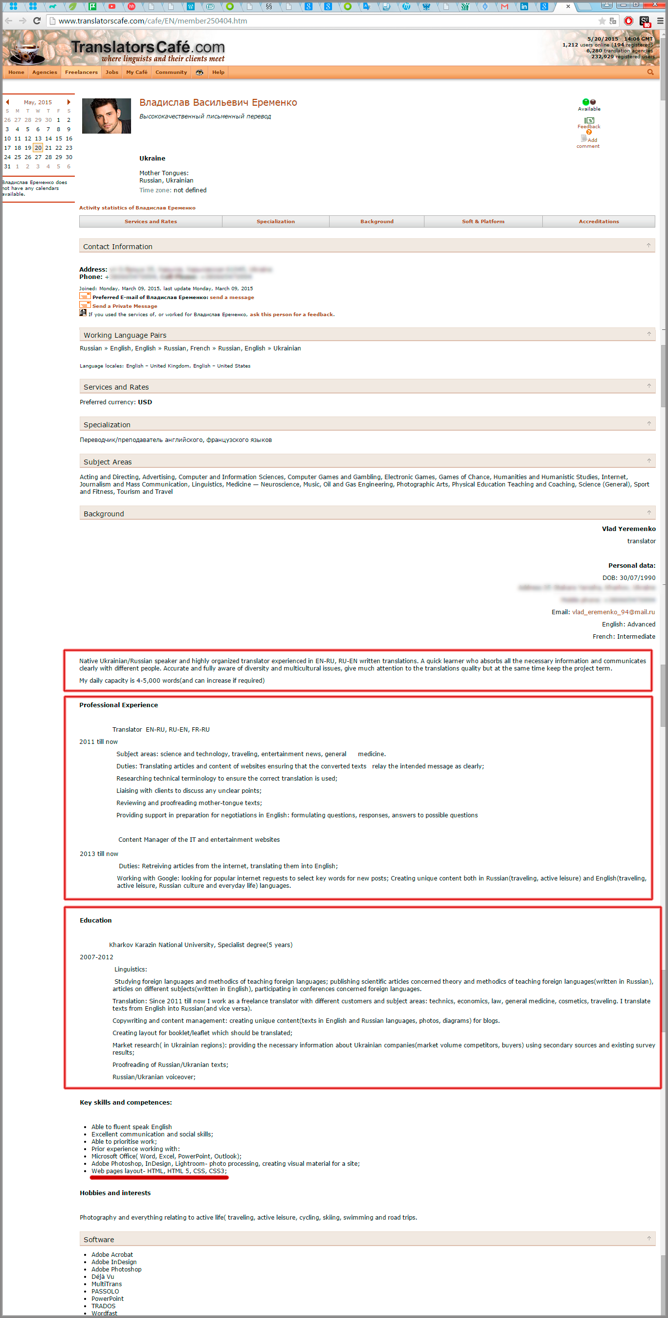 Стоит отметить, что пользователь с translator’s cafe не просто скопировал отдельные пункты, нет 🙂 Он пошел дальше и бездумно скопировал всё, включая мои интересы, упоминание навыка HTML-вёрстки и статей, которые я публиковала ещё во времена учёбы в университете. А если ВСЁ это вас попросят продемонстрировать?