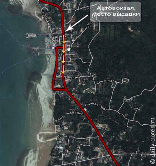 Белой стрелочкой обозначено место, где находится автовокзал, оттуда вам нужно будет подойти к главной дороге (отмечена красным цветом) и, не переходя ее, пойти налево, так, чтобы море было по правую сторону от вас. По дороге вы встретите много недорогих гостиниц и хостелов, где можно переночевать и оставить вещи на время пока вы ищете нормальное жильё. Мы останавливались в Nathon Residence — достаточно бюджетной гостинице, их номера и обслуживание у нас нареканий не вызвали. Только одно «но» — в некоторых номерах окна выходят на соседние здания, т.е. на стены :).