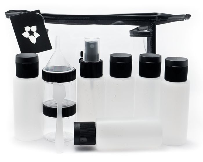 У Л’Этуаль есть 2 дорожных набора — побольше и поменьше. В тот, что побольше (на фотографии) входит пластиковый пакет на молнии, 5 обычных флаконов для жидкостей по 60 мл, 1 флакон с пульверизатором 60 мл, 2 баночки для кремов по 30 мл, 1 лопатка и 1 воронка. Стоит это удовольствие около 800 рублей.