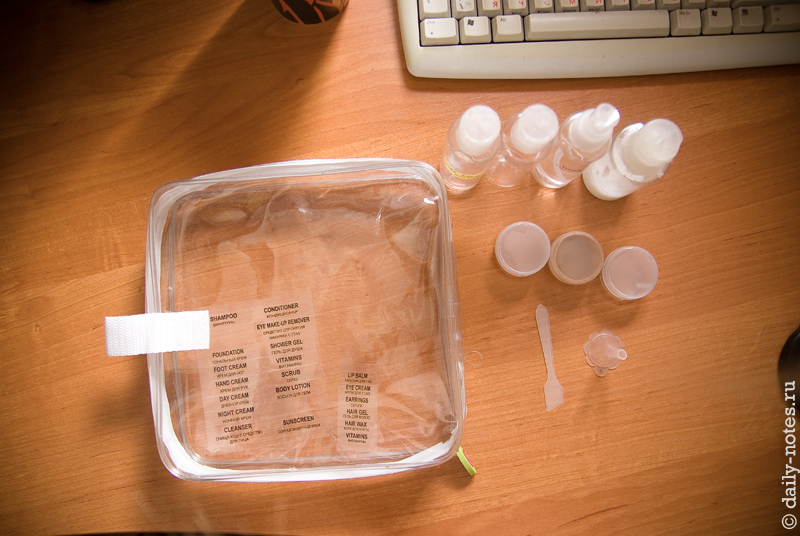 в-третьих,  все жидкости должны провозиться в прозрачном пластиковом пакете.Самый удобный вариант в данном случае — купить так называемый «набор путешественника», который представляет собой прозрачный пластиковый пакет на молнии с набором пустых бутылочек и баночек, которые отвечают всем правилам провоза жидкостей в ручной клади. Найти такие наборы можно в Рив Гоше, Л’Этуале и The Body Shop (возможно есть и в других магазинах). Выглядят они примерно так: