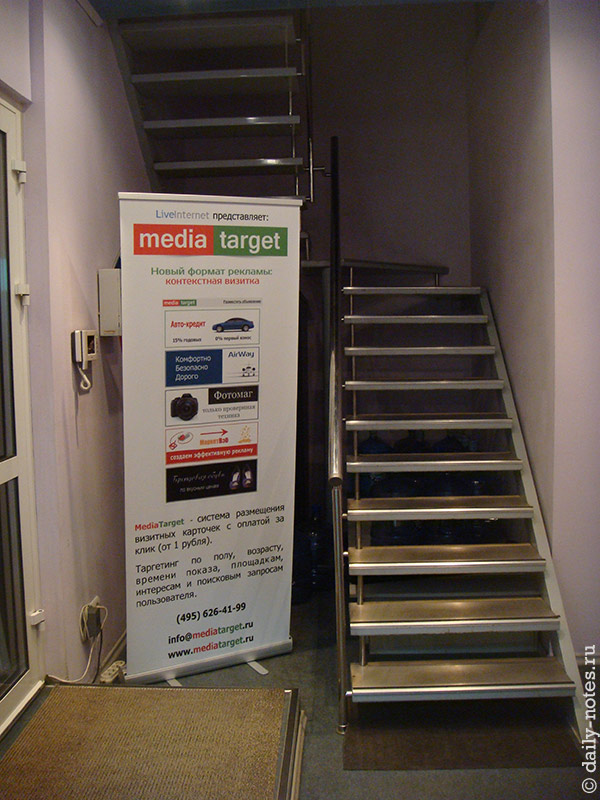Если от входа пойти налево, то мы увидем большую алюминиевую лестницу на второй этаж. Так же мы увидим баннер Media.Target, который был распечатан для какой-то давно прошедшей выставки. Под лестницей живут бутыли для кулера и серверная стойка, которая никогда не видела серверов… Так же лестница славится тем что когда-то с нее по молодости падал сам Валентин Любимов 🙂