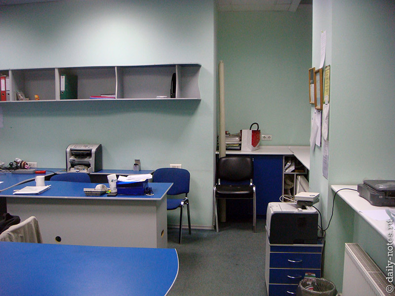 В комнате ресепшина находится ход в кладовку, в которой можно при необходимости даже черта лысого найти. Фотки не прилагаю, ибо секретно. Если от входа пойти направо, то мы увидим зал примерно 6х6, где работают сотрудники компании. Самый крутой стул у руководителя 🙂