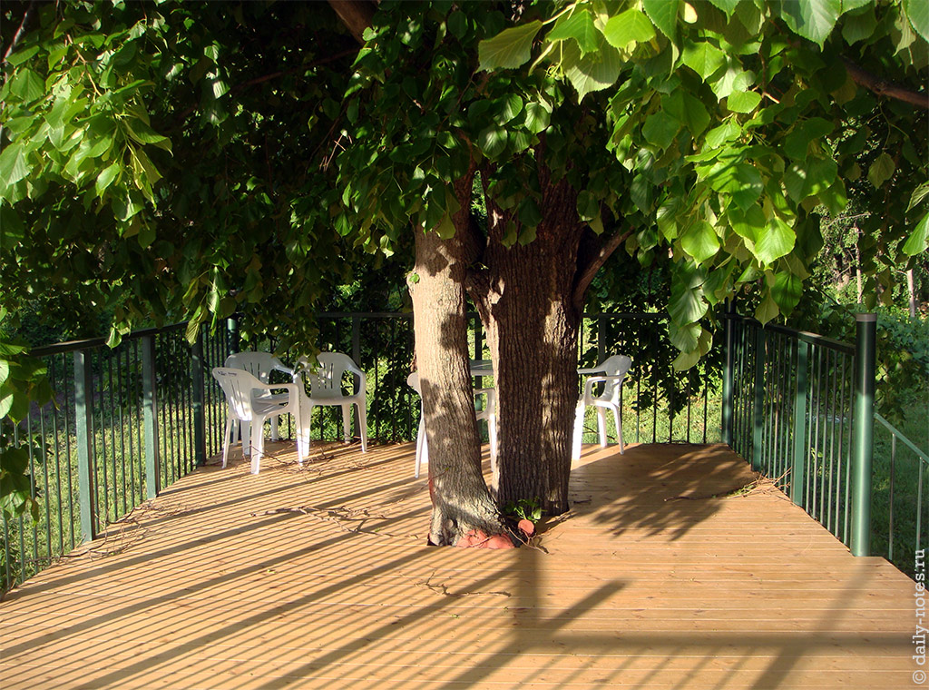 Первый спальный корпус оборудован балконом, на котором в хорошую погоду можно приятно поработать в тени деревца. Сейчас погода ветреная, но к середине лета будет в самый раз. Считаю, что туда стоит протянуть розетку.