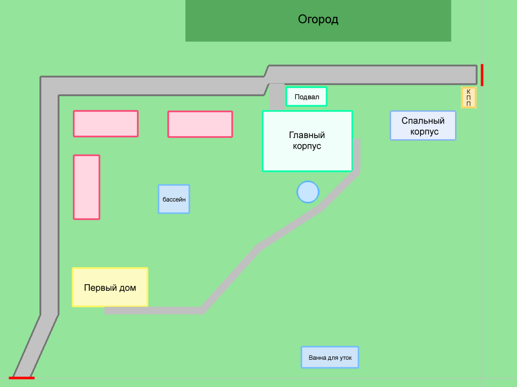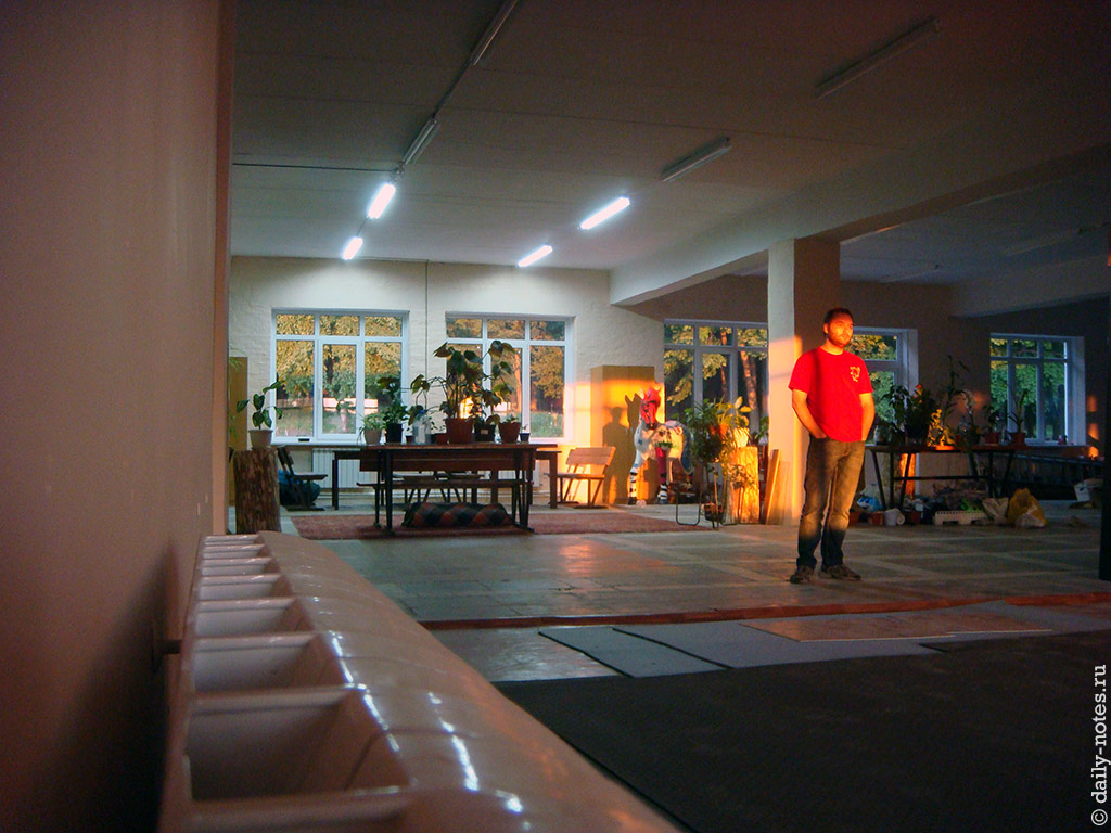 Рядом со спальным корпусом находится главный корпус — он же по совместительству столовая, он же рабочее пространство, в нем же будет отведена комната для детей и комнаты для отдыха. Как это будет устроено я пока не знаю, но дети не будут мешать работать программистам. Пока перешеек между спальным корпусом и главным корпусом используется как парковка. По совместительству это детская площадка: