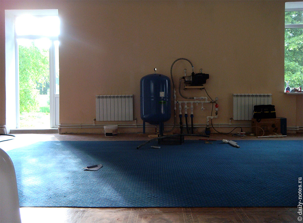 В здании есть гидроаккумулятор, позволяющий поддерживать оптимально давление воды, но пока он отключен, т.к. давит уж очень слишком: трубы лопаются и шланги срывает.