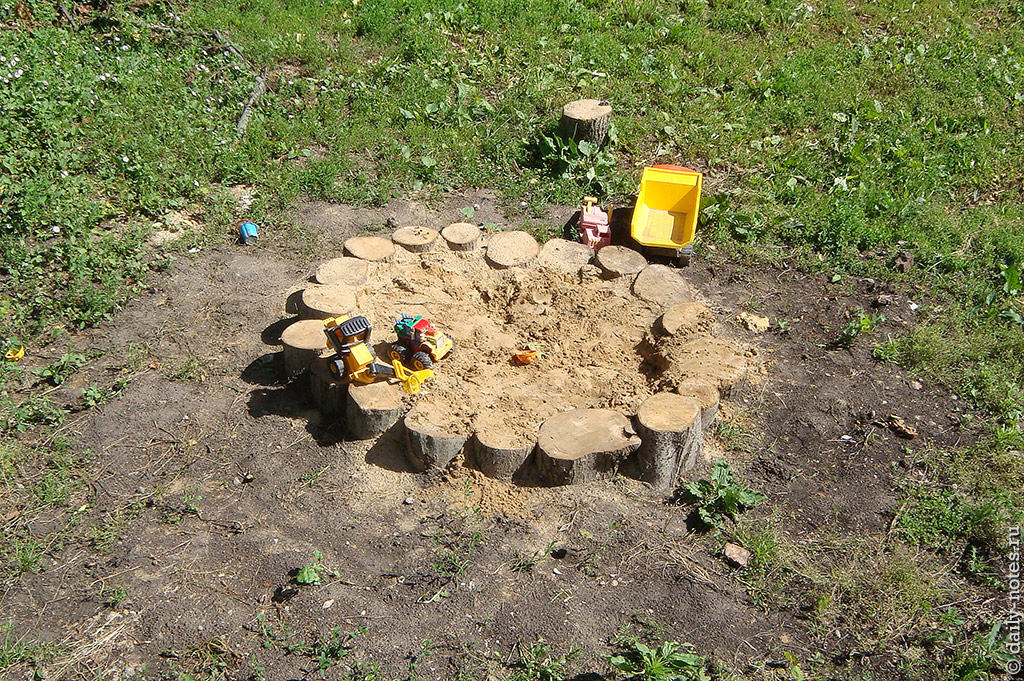 Детская площадка уже есть в планах и для нее уже найден поставщик качелей из числа местных умельцев. В свободное от работы время мы с Валей построили на будующей детской площадке песочницу из подручных средств и сдали в эксплуатацию.