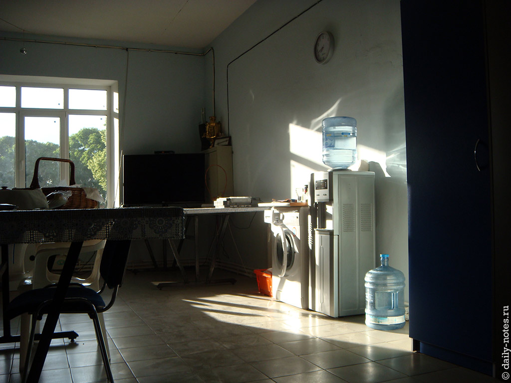 Теперь посмотрим что внутри главного корпуса. Начнем с кухни. Кухня оборудована всем самым необходимым и даже с излишком. Есть две газовые плиты, два холодильника, две раковины, микроволновка, чайники, кофеварка, мультиварка, кулер ну и ящик для любителей «дом2». Так же есть стиральная (юзал) и посудомоечная машина (не юзал). Для полной радости не хватает только принудительной вытяжки.