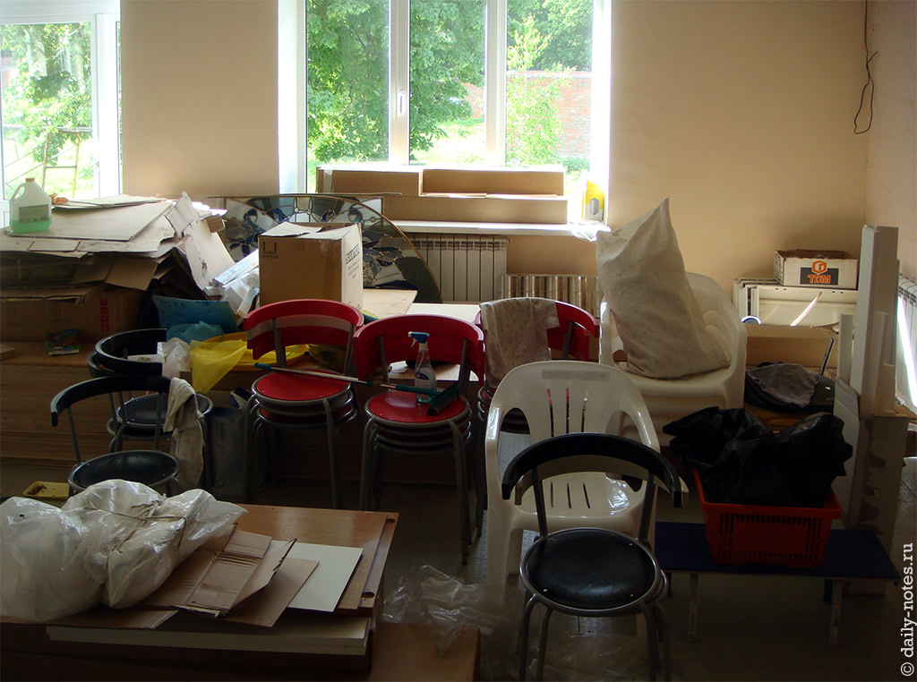 Отделка закончена на 50%: еще не положили линолеум, не установили лампы и розетки в половине здания.