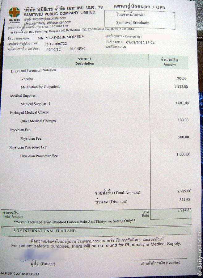 Прибыв в Бангкок, мы первым делом связались с нашей страховой компанией: сначала с нам разговаривала оператор, потом нас консультировала врач, потом страховая связывалась с больницей в Бангкоке, в которую нам можно было попасть. На всё ушло около часа-полутора, когда нам позвонила оператор, с которой мы разговаривали, и сообщила нам название и адрес больницы, в которую нам предстояло ехать (для удобства сообщение было продублировано по электронной почте, чтобы показать таксисту адрес и ничего не напутать). С больницей нам повезло, мы попали в Samitivej Hospital Bangkok, где нас встретил приветливый персонал, объяснил какие документы нам надо заполнить и т.п. информацию. После 15-минутного ожидания нас пригласили в «предварительный» кабинет 🙂 Там сидела медсестра, которой нужно было вкратце объяснить что произошло, а также сказать про индивидуальные особенности организма — вес, рост, непереносимость препаратов. После это кабинета нас по одному пригласили в кабинет к врачу, где с нами начали непосредственно работать — обрабатывать раны, давать обезболивающее, делать перевязку и самое главное (!!) — делать уколы от столбняка 🙂 Ужас. Напоследок нам вручили ещё кучу лекарств для самостоятельной обработки ран и 2 счета общей суммой на 18 тысяч батт за оказанные услуг. В общем, страховку мы окупили… 4 раза, а то и больше.