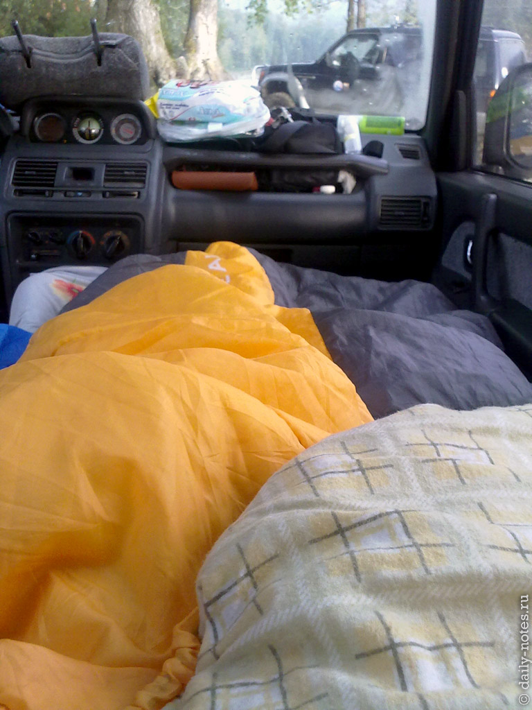 Следом мы закупили продукты на неделю, запаслись водой, взяли спальники и решили, что всю неделю будем спать в машине. Кто пробовал спать в Mitsubishi Pajero II, знает какая неровная поверхность образуется при откидывании передних сидений, поэтому для выравнивания поверхности мы отнесли в салон небольшой матрас.
