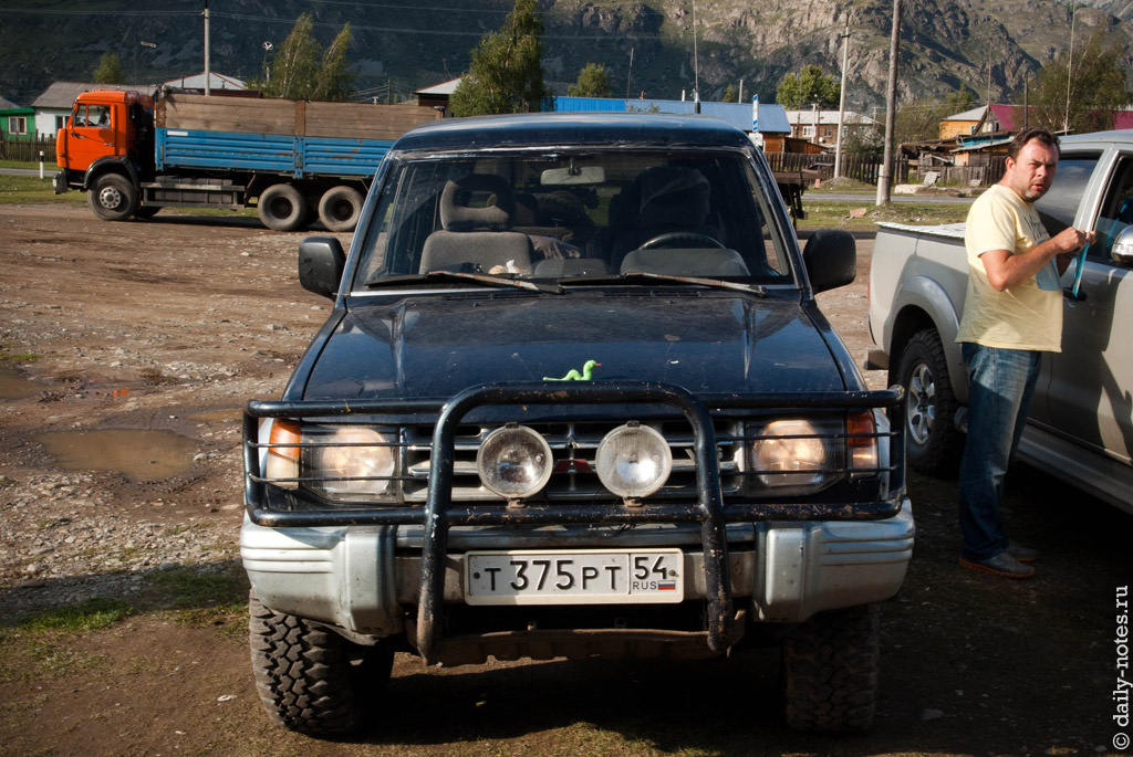 Очень долго катались и спорили, где нам остановится, но в конце концов свернули с трассы, заехали в какой-то поселок недалеко от Кош-Агача, проехали его насквозь и остановились там.