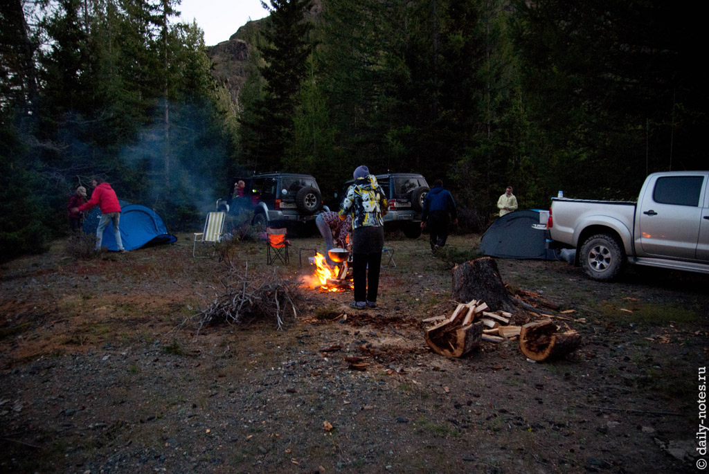 На стоянку мы приехали затемно и там уже кто-то был. Поговорив с людьми у костра, Саша предложил остановиться здесь же, только чуть отъехав от чужого лагеря, чтобы никому не мешать.