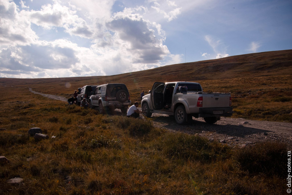 Дальше было много споров на тему «куда поехать?», «каким путем?» и т.д. В конце концов, все сошлись во мнении, что пора ехать домой, и, скорее всего, через горный перевал Теплый ключ. Время было уже позднее, поэтому решили двинуться в сторону перевала, пройти его немного и остановиться на ночевку перед развилкой на старую дорогу и Теплый ключ.