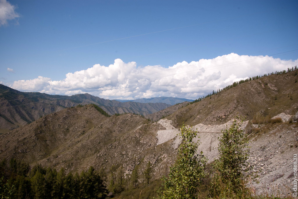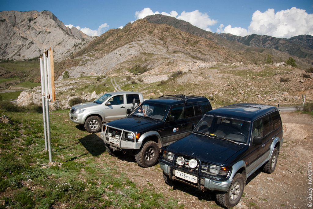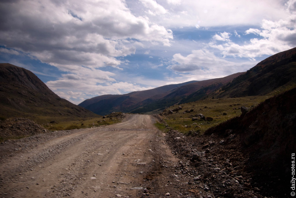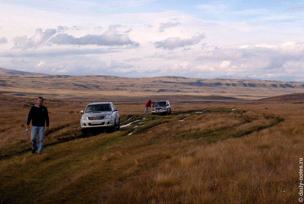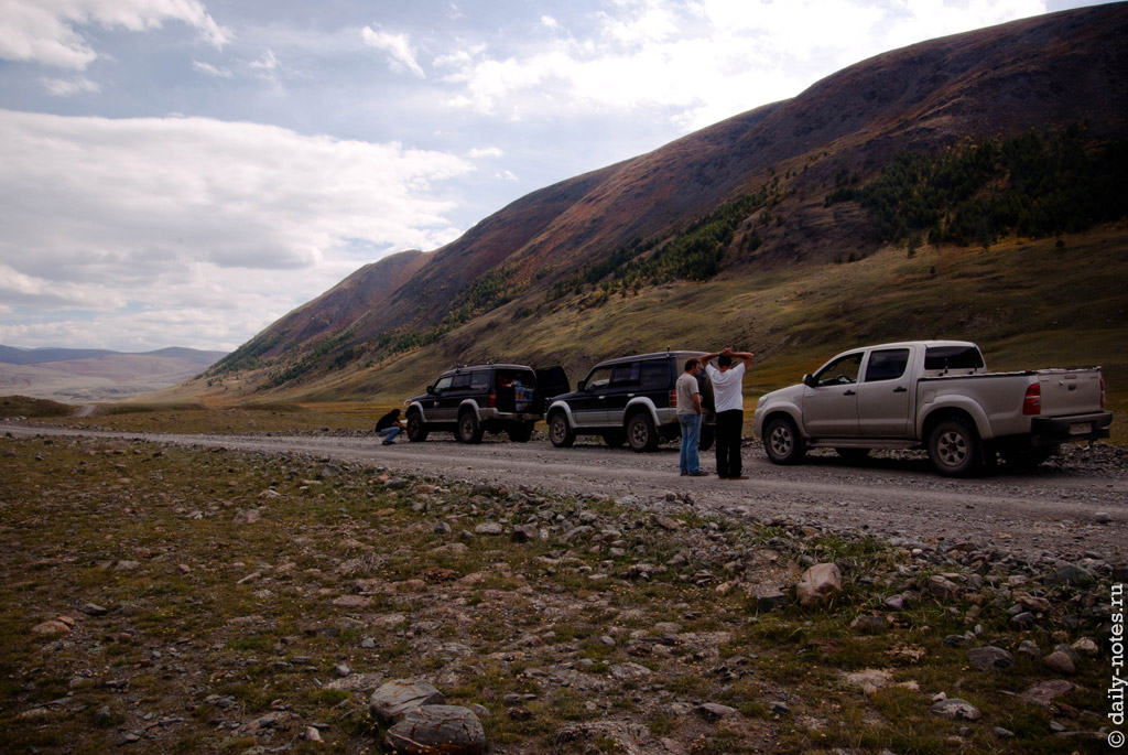 Через некоторое время мы проехали погранзаставу и встретили возвращавшихся с Укока ребят. Они нас предупредили, что на горном перевале Теплый ключ есть место, где посреди дороги валяются два здоровенных камня размерами с машину — проехать можно, но как-то «очково» (это слово в полной мере описывает эмоции, которые мы испытали, проезжая их), потому что приходится подъезжать к самому обрыву.