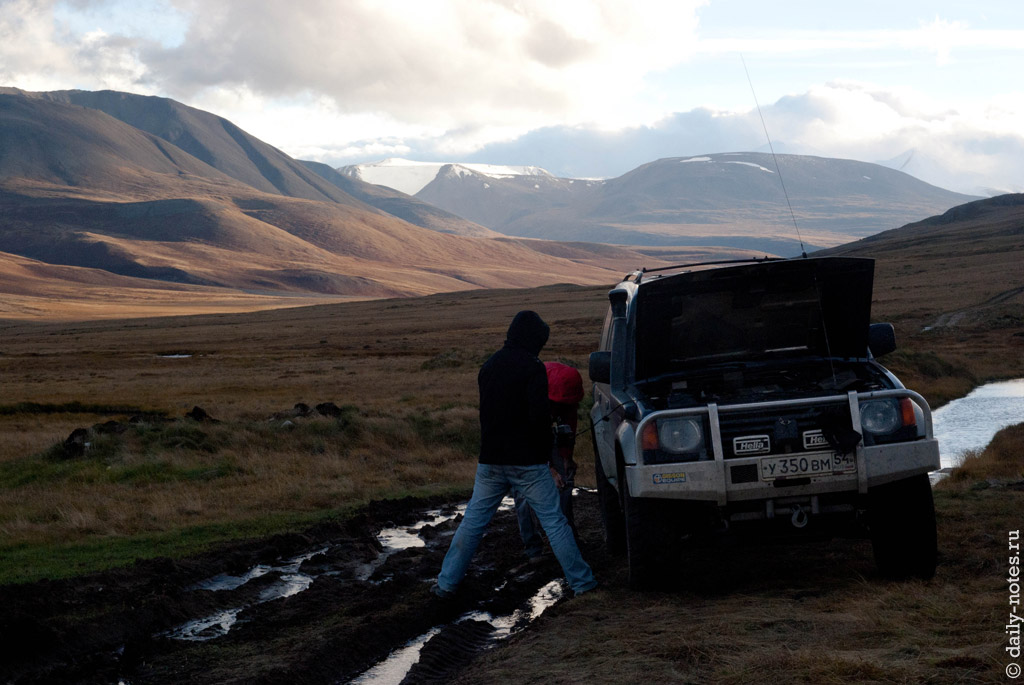 Дальше было много споров на тему «куда поехать?», «каким путем?» и т.д. В конце концов, все сошлись во мнении, что пора ехать домой, и, скорее всего, через горный перевал Теплый ключ. Время было уже позднее, поэтому решили двинуться в сторону перевала, пройти его немного и остановиться на ночевку перед развилкой на старую дорогу и Теплый ключ.