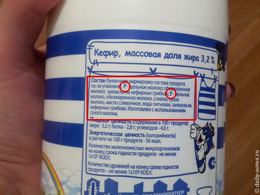 Согласно этикетке кефир у «Простоквашино» бывает двух типов: нормальный (под маркировкой P) и разбавленный водой с добавлением сливочного масла (боже мой, зачем?!) и фиг пойми чего ещё (под маркировкой У).