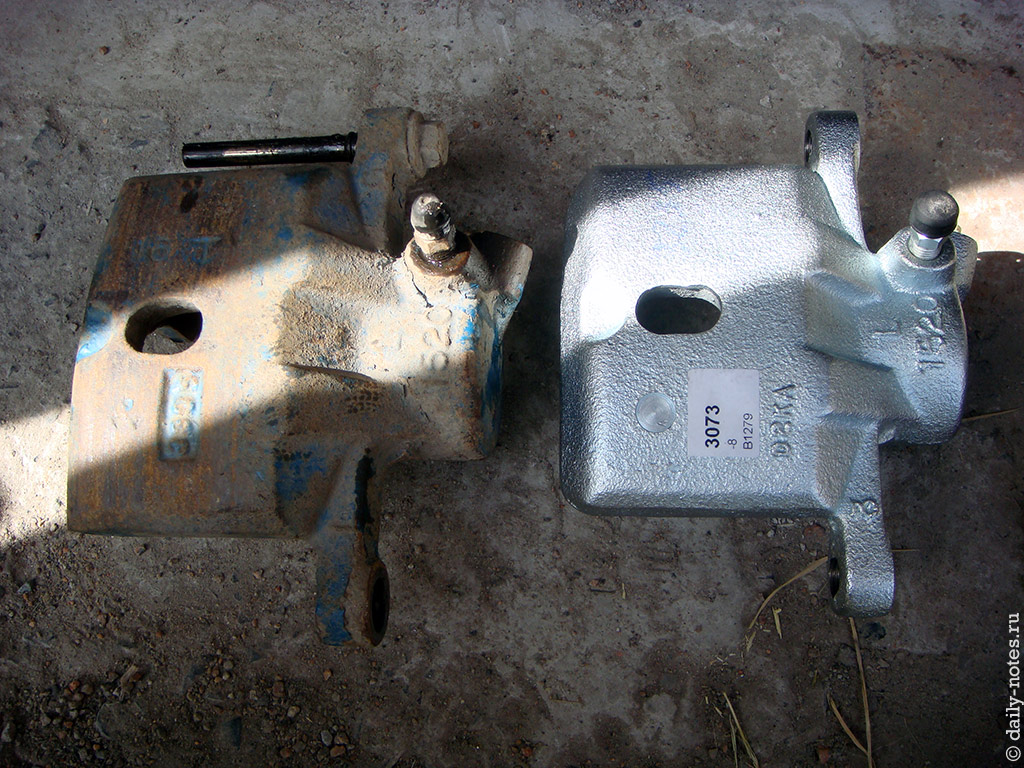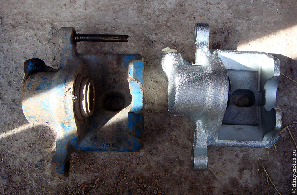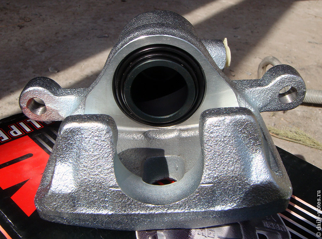 В которой находится суппорт без единой ржавинки и на 99% похожий на оригинальный (есть мелкие различия в буквах, отформованных на наружней стороне суппорта).