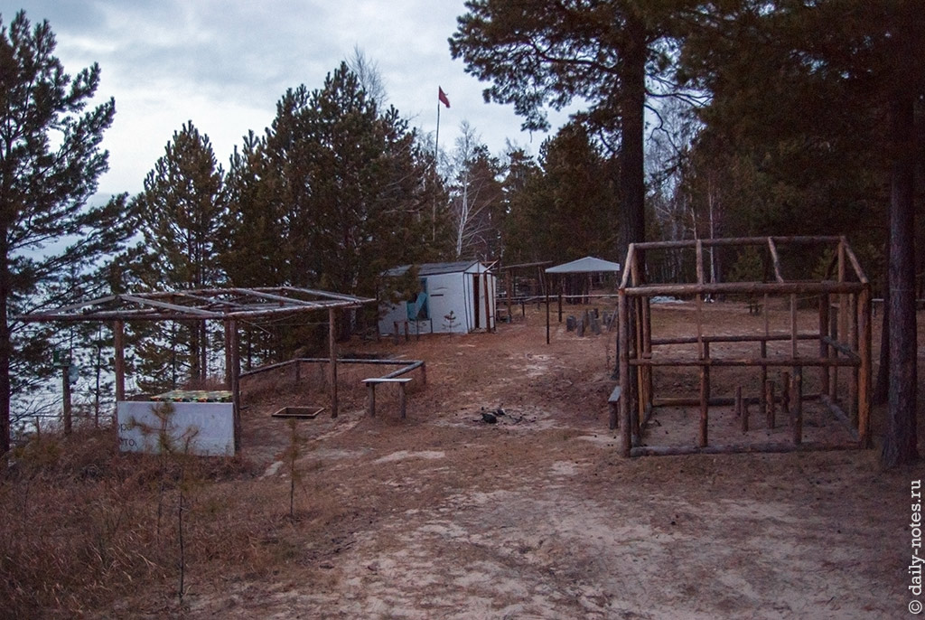 Какая-то самопальная стоянка рыбаковПостроек на берегу много: около 20 времянок и примерно столько же туалетов в кустах, метрах в 20 от них. Видно, что люди проводят время на берегу не первый год, есть постройки типа лестниц, землянок, заборов, клумб и еще каких-то непонятных сооружений.