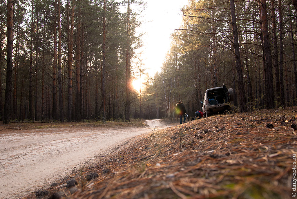 Очередная дорога в лесуНавигация нас завела в просеку с перепадами 30-40 градусов и следами отчаянных пробуксовок предыдущих водителей. Просека плавно перешла в болото, которое успело удачно подмерзнуть, и мы в нем не утонули. В темноте штурмовали километр просеки в замерзшем болоте и выехали на берег, обустроенный летними рыбаками. Снято на ISO 400-ISO 800 в темноте, без вспышки и на ручном фокусе, а потом вытянуто в фотошопе. В итоге, получилось светло, как днем, но шумов туча 🙁