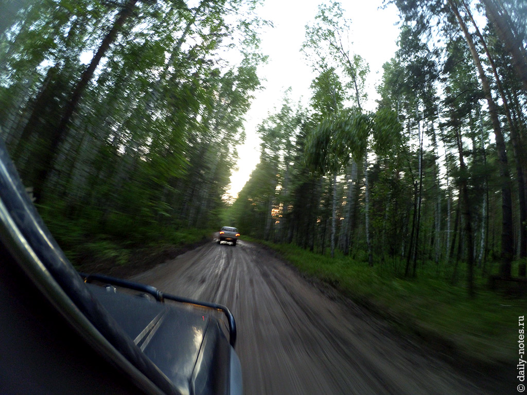 Не туда свернулиОтлично! Свернули не туда, выезжаем на нужную дорогу и едем дальше. Уже на подъезде к Караканскому бору, где-то около поселка с эпичным названием «Факел Революции», решили остановиться, чтобы пофотографировать пыль на дороге 🙂