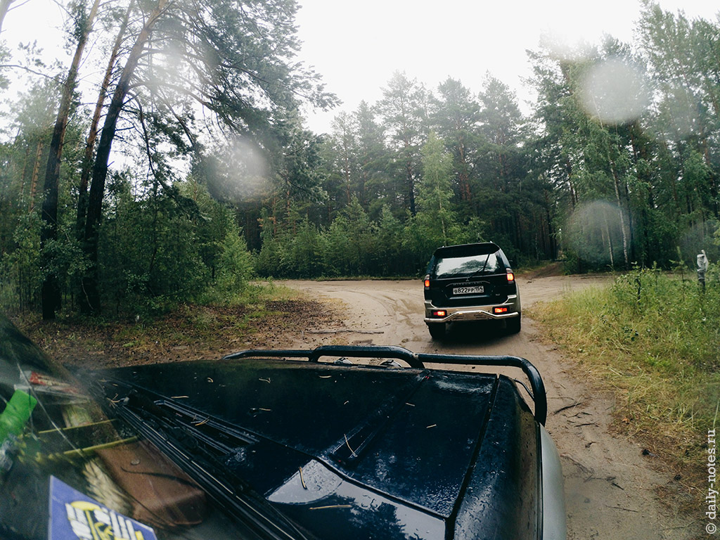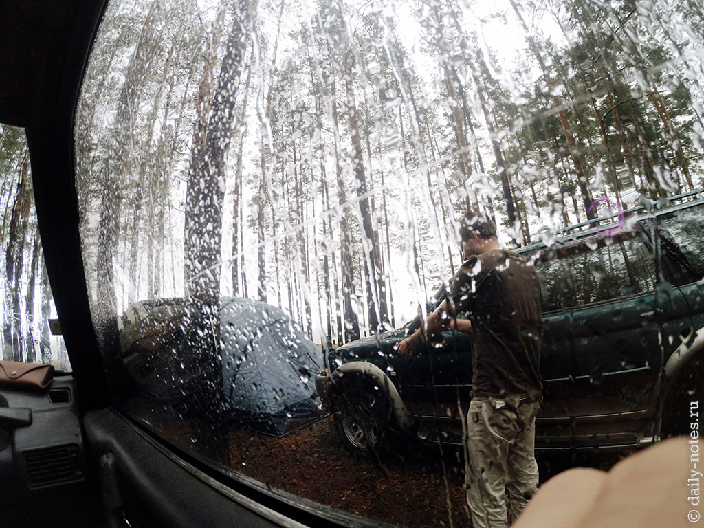 Конечно, в дождливой погоде есть свои преимущества: например, в выходные дни людей в лесу практически не было (за исключением рыбаков, которых вообще ничем не испугаешь). Да и комаров каплями сразу прибивало к земле 🙂 Но особого удовольствия от такой поездки всё равно не получишь, потому что нужно постоянно прятаться в палатке или машине.