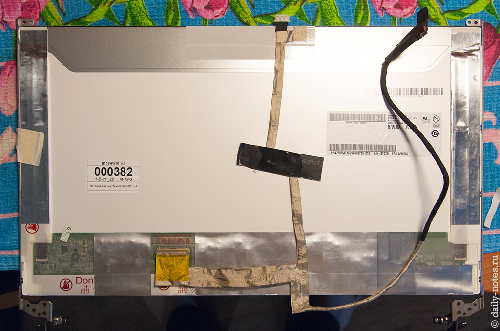 После этого, мне оставалось только выбрать подходящую матрицу (с теми же размерами, креплениями и расположением разъема, как у старой матрицы) с 6-битным LVDS — в этом мне помог сайт panelook.com. Потратив некоторое время на поиски, я остановил свой выбор на матрице AUO B156HW01 v4 (Full HD, матовая, с улучшенной цветопередачей и энергопотреблением 11W), в интернете она стоила около 130 USD за Grade A++ (без битых пикселей и прочих дефектов).