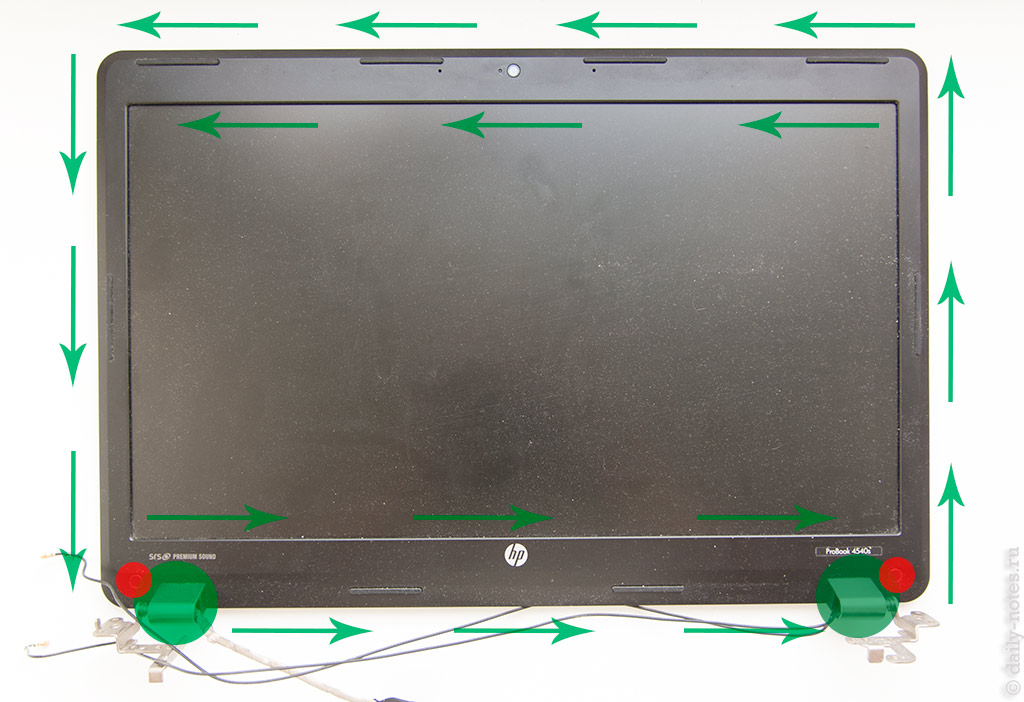 После снятия заглушек берем медиатор (или любой подобный инструмент), чтобы отсоединить защелки, расположенные вдоль периметра с наружной части крышки — делаем это вдоль указанных стрелок. Два дополнительных ряда защелок, расположенных с внутренней стороны крышки следует отсоединять в последний момент, аккуратно подцепив каждую из них ногтем и потянув наверх (при неосторожности можно повредить матрицу ноутбука).