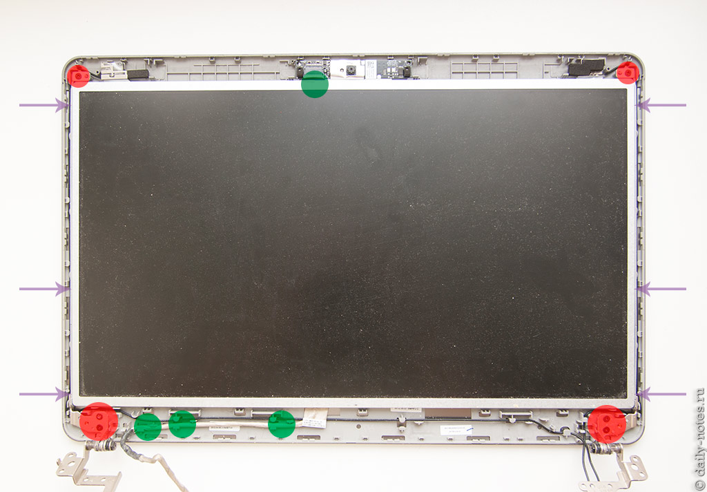 HP Probook 4540s извлечение матрицыТеперь, когда крышка разобрана, осталось снять матрицу, для этого освободим шлейф матрицы и шлейф камеры (отмечен зелеными кружочками). После этого выкручиваем 6 винтов, которые держат петли с матрицей (отмечено красными кружочками). Аккуратно извлекаем матрицу с петлями и вывинчиваем по 3 винта с каждой стороны (показано фиолетовыми стрелками).