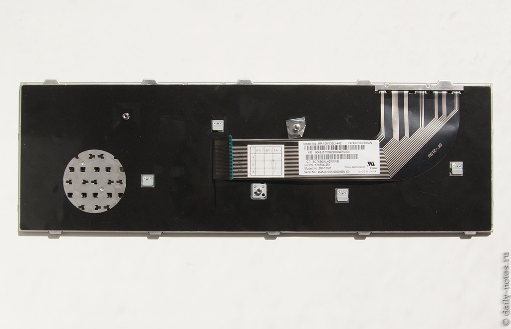 Снимаем клавиатуру HP 4540sПереворачиваем ноутбук и снимаем клавиатуру. Для этого её надо сдвинуть вниз, затем приподнять верхний край и вынуть. Зелеными кружками отметил боковые защелки клавиатуры — при сборке туда потребуется надавить, чтобы она встала на свое место.