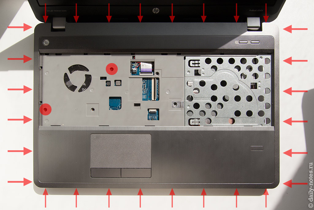 Снимаем верхнюю панель корпуса hp 4540sВыкручиваем 2 винта, держащих верхнюю панель. После этого панель держится только на защелках, расположенных по периметру корпуса. Поддеть их можно пластиковой картой или пластиковым медиатором. Не используйте железные предметы — краска легко сдирается. Отсоединять верхнюю панель стоит очень осторожно, т.к. непосредственно под тачпадом находится шлейф с разъемом— его надо аккуратно отсоединить (на фото не показано).