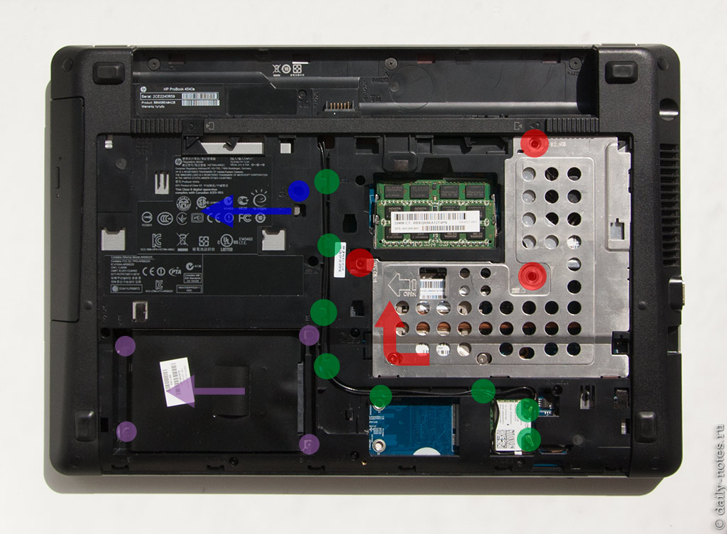 • HDD — можно случайно уронить ноутбук и стрясти ему голову (помечен фиолетовыми кружочками);