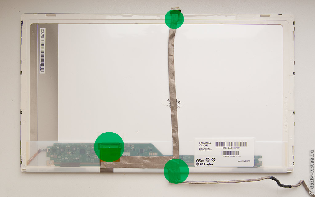 LP156WH4-TLD2 вид сзадиСзади к матрице ноутбука HP Probook 4540s приклеен шлейф, идущий к разъему LVDS и камере. Отсоединять его следует очень аккуратно, т.к. к матрице он приклеен скотчем, при неловком движении можно порвать белую подложку светодиодов. У меня не было необходимости отклеивать шлейф, т.к. я планировал использовать другую матрицу с другим шлейфом. Зелеными кружочками показаны места крепления шлейфа.
