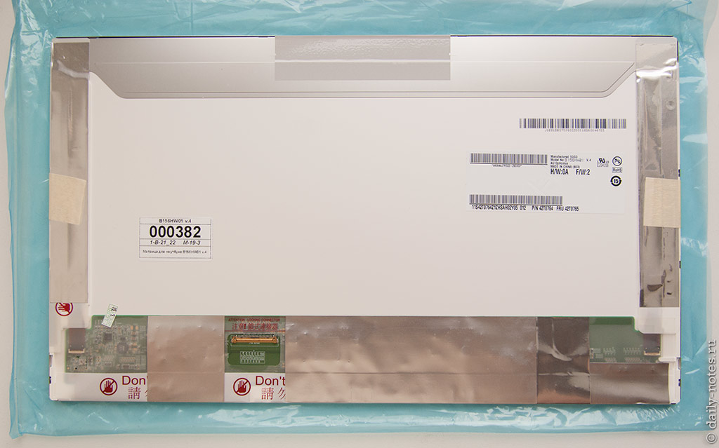 После этого, мне оставалось только выбрать подходящую матрицу (с теми же размерами, креплениями и расположением разъема, как у старой матрицы) с 6-битным LVDS — в этом мне помог сайт panelook.com. Потратив некоторое время на поиски, я остановил свой выбор на матрице AUO B156HW01 v4 (Full HD, матовая, с улучшенной цветопередачей и энергопотреблением 11W), в интернете она стоила около 130 USD за Grade A++ (без битых пикселей и прочих дефектов).