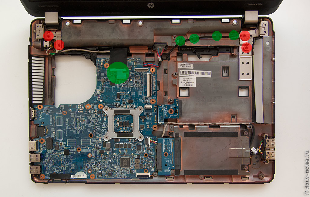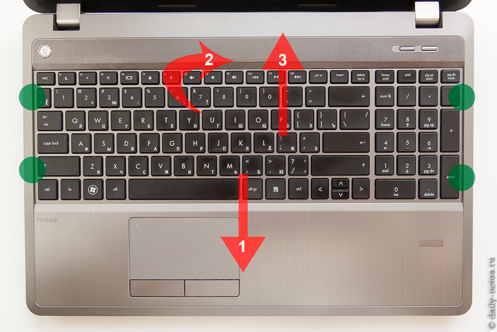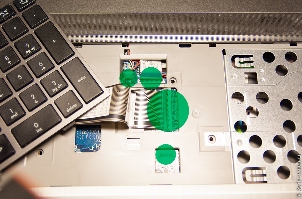 Снимаем клавиатуру HP 4540sПереворачиваем ноутбук и снимаем клавиатуру. Для этого её надо сдвинуть вниз, затем приподнять верхний край и вынуть. Зелеными кружками отметил боковые защелки клавиатуры — при сборке туда потребуется надавить, чтобы она встала на свое место.