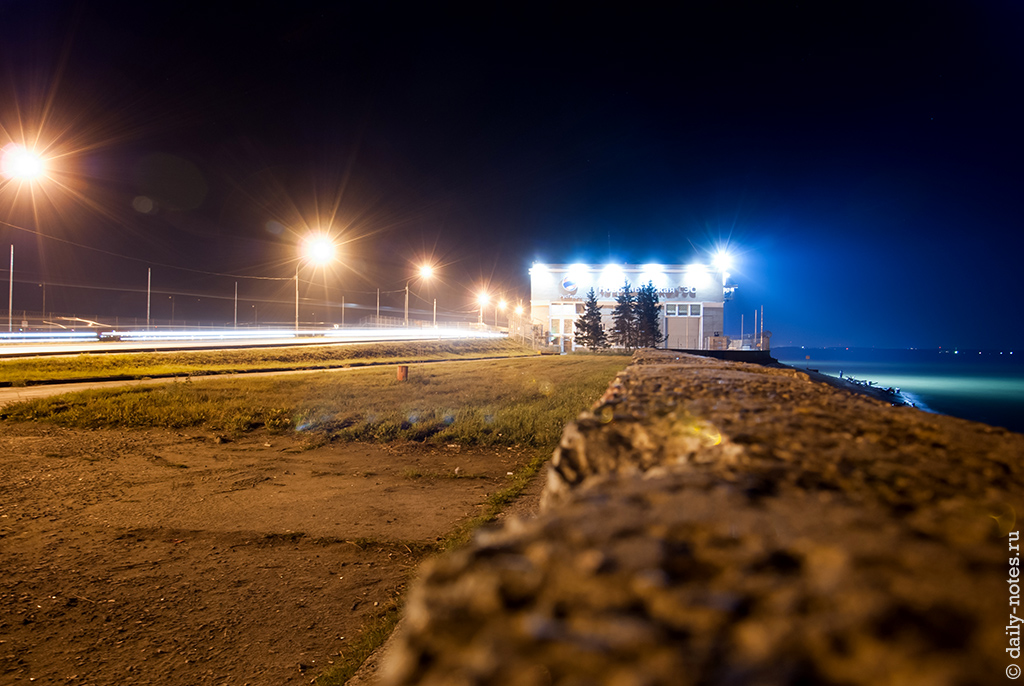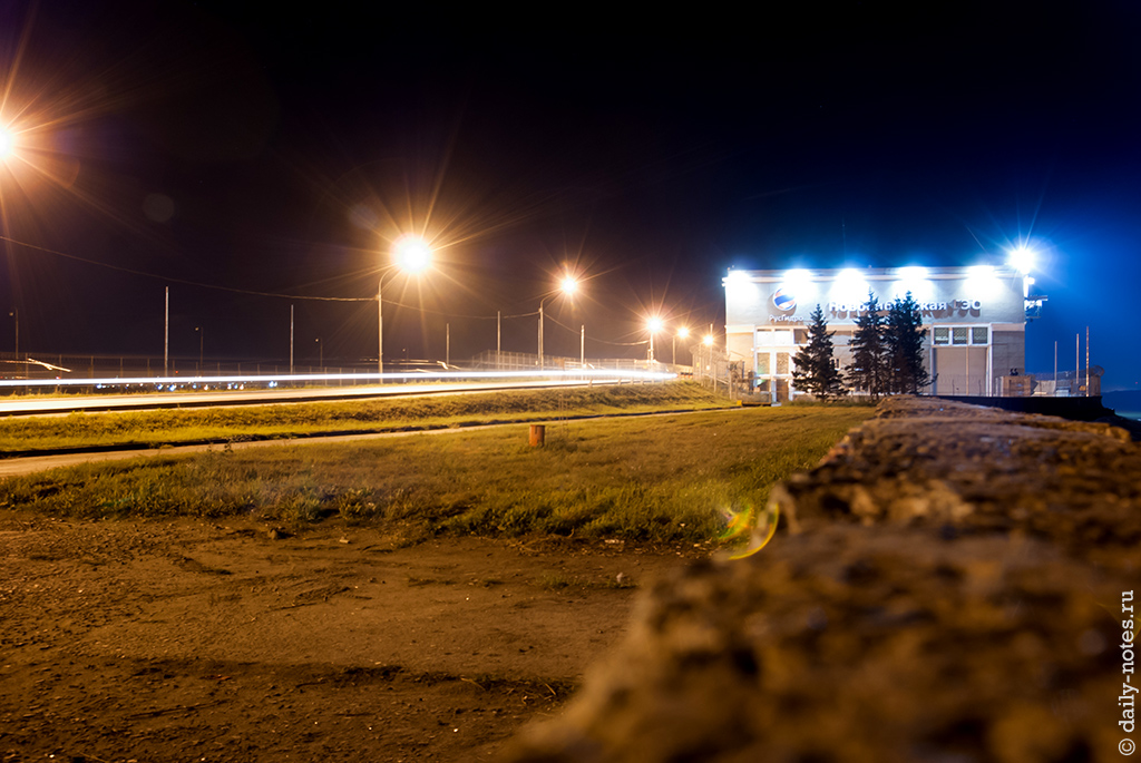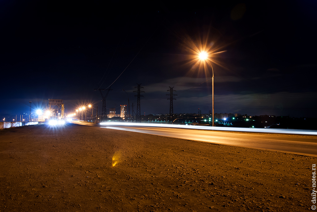 Как назло, пока мы раскладывали штатив, вплотную к зданию ГЭС подъехали две машины и встали прямо перед объективом — стояли там с включенными фарами и не думали уезжать. Мы так и не дождались момента, когда они уедут, пришлось отойти подальше, но засвет в области ГЭС всё равно нехилый.