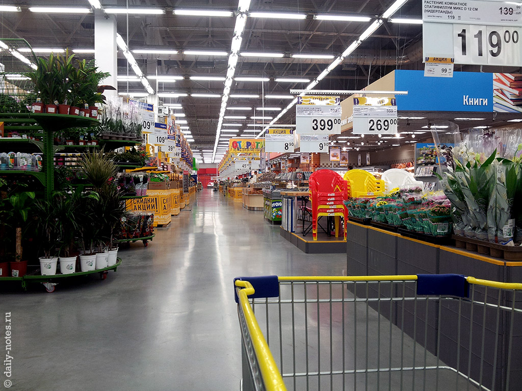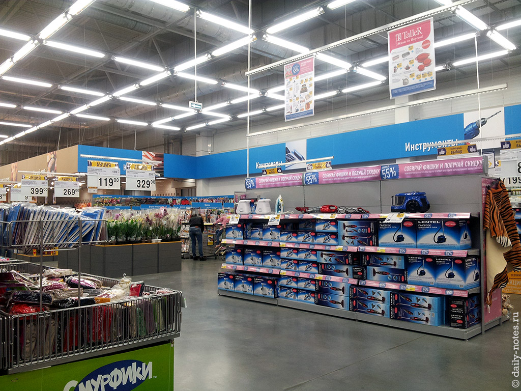 В целом, о гипермаркете в микрорайоне Родники сложилось более приятное впечатление: светлый, чистый (пока новый, видимо 🙂 ), просторный. Неплохой выбор товаров, хотя чего-то и меньше, чем в Гиганте. Но это оправдывается тем, что Родники, всё-таки, спальный район и покупателей здесь будет меньше.