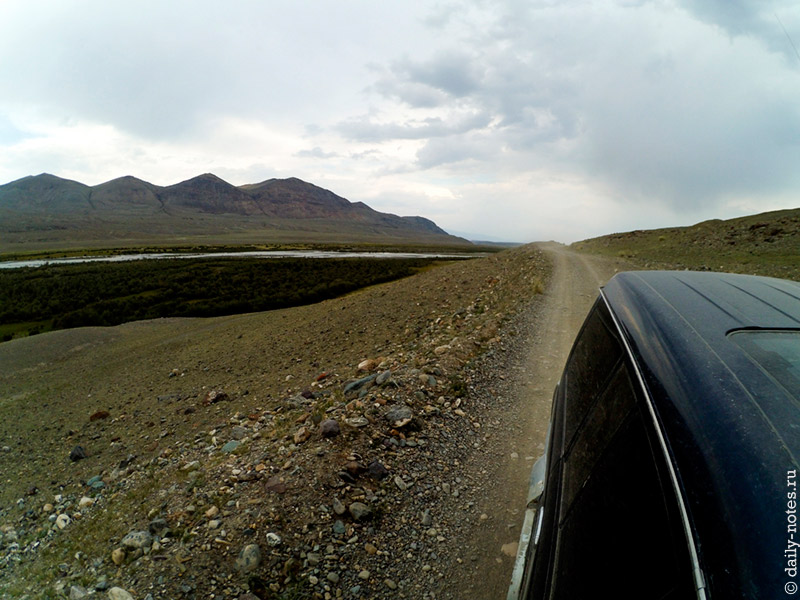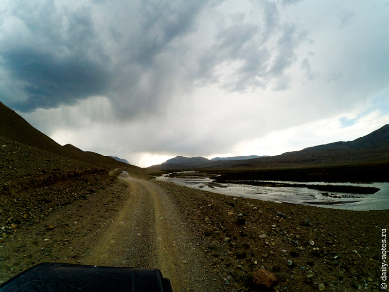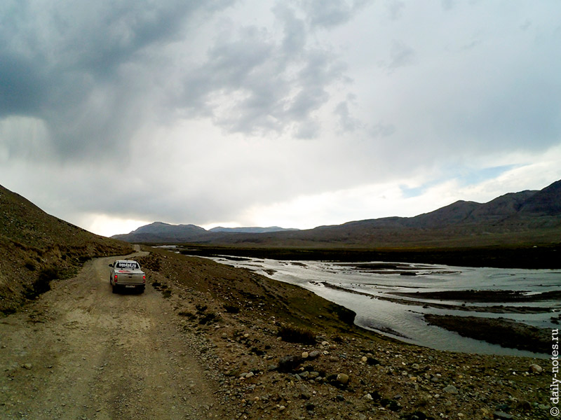 После спуска с перевала началась самая «весёлая» дорога: в первую очередь, из-за большого количества бродов с мутной водой и огромными камнями на дне. Несколько раз мы треснулись о них брюхом, но все агрегаты, к счастью, уцелели.