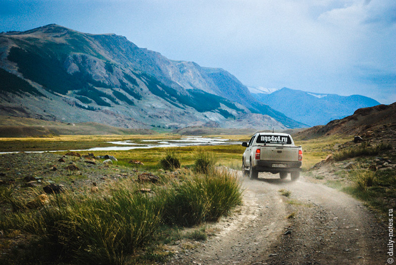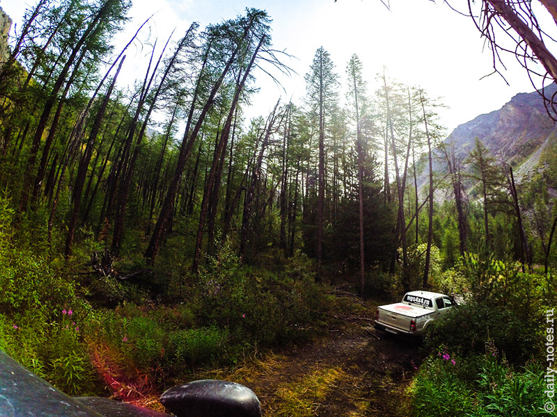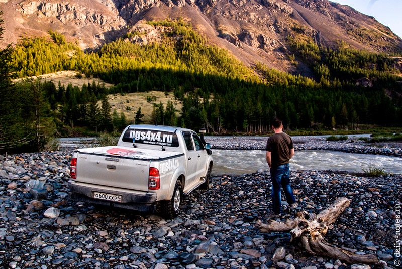 В некоторых местах броды можно было объехать (иногда ценой машины). Именно в одном из таких мест Саша на своём Hilux чуть не нырнул боком в реку — из-за уклона и постоянно сползающих в воду камней. Мы после него решили, что лучше ещё раз треснемся брюхом об камни и объехали злополучную дорожку.