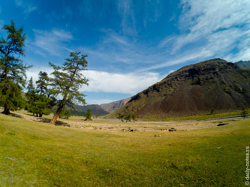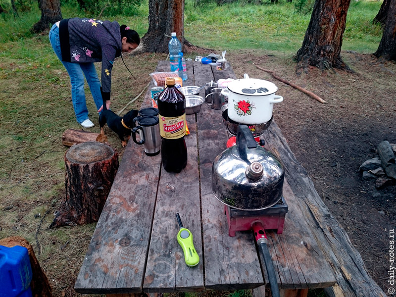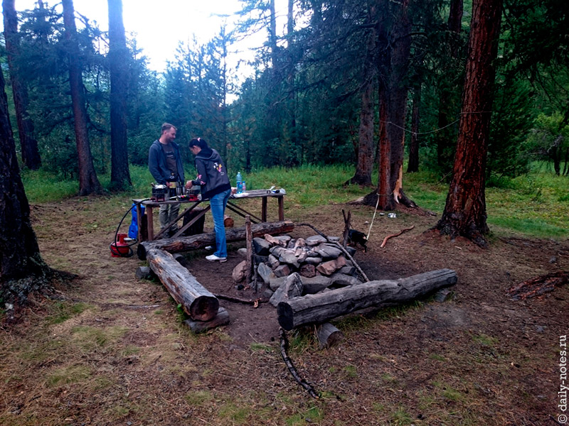 Подъехав к Карагемской поляне, мы обнаружили там алтайцев. Поначалу сложилось впечатление, что они были не совсем нам рады, но после встречи с нашим главным дипломатом и переговорщиком в лице Саши всё немного устаканилось: Саша успел их и полебедить, и за козлами с ними съездить.